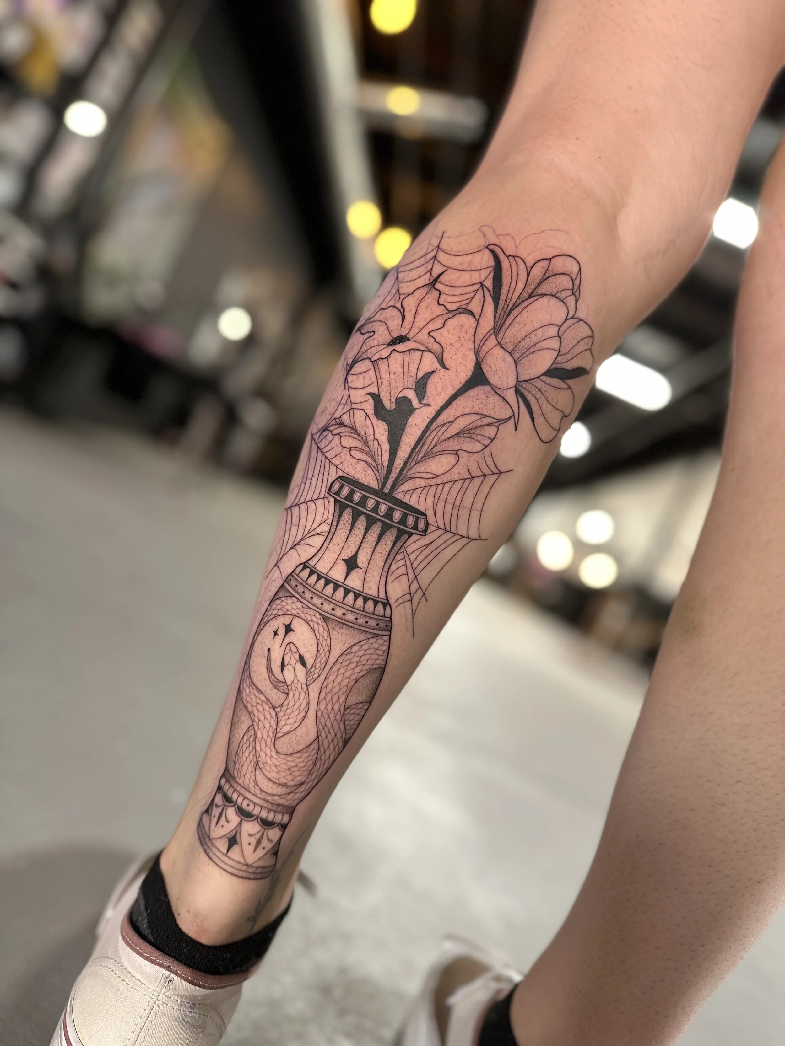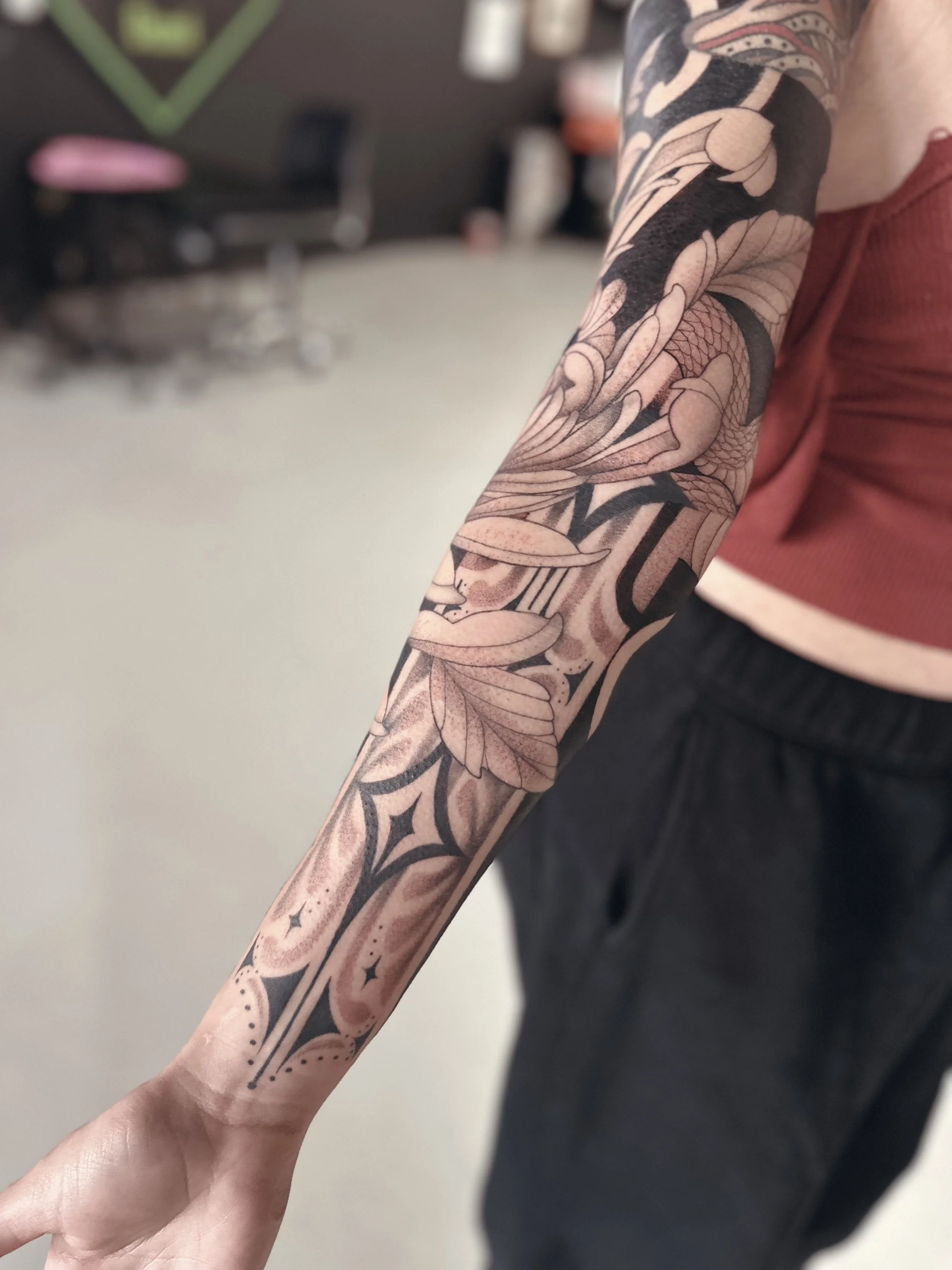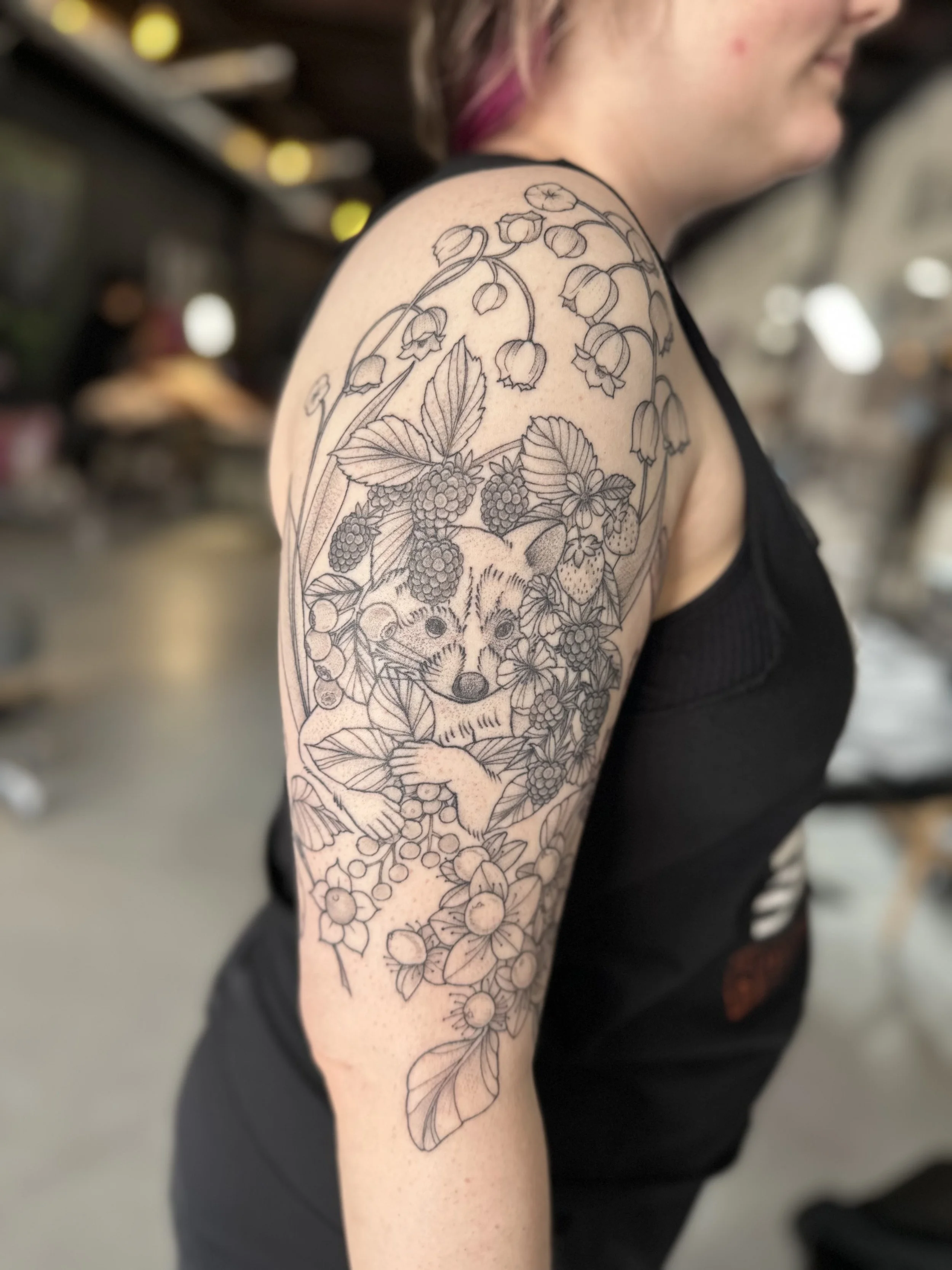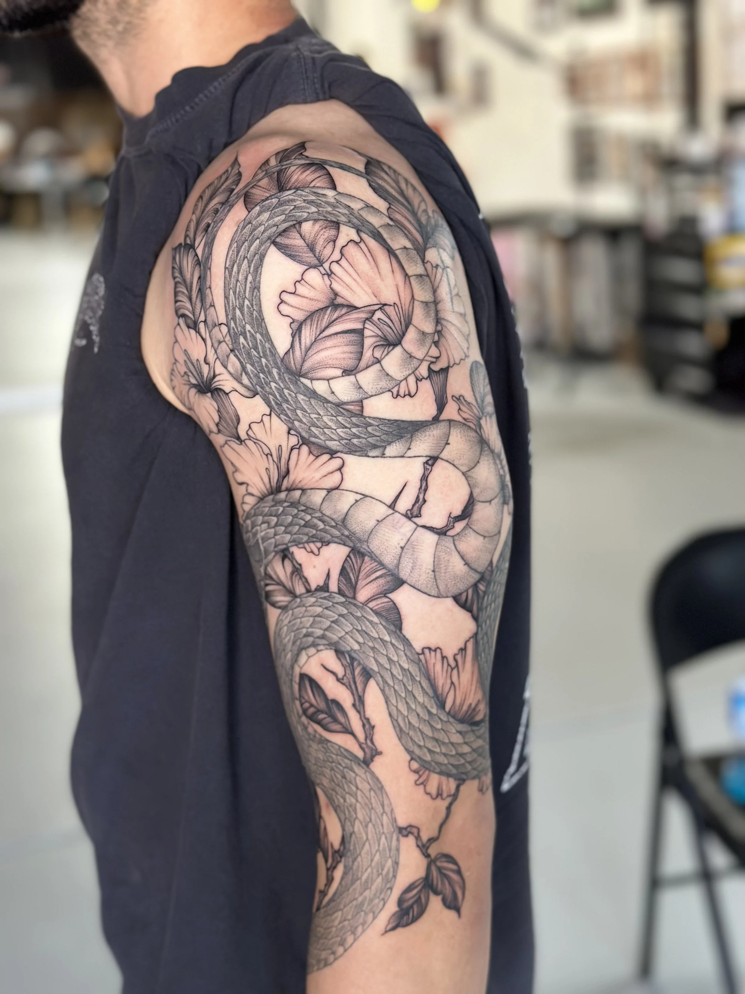 In terms of technique, I love doing illustrative blackwork and black and grey, but you’ll also find me working with color and the occasional traditional and neotraditional piece.